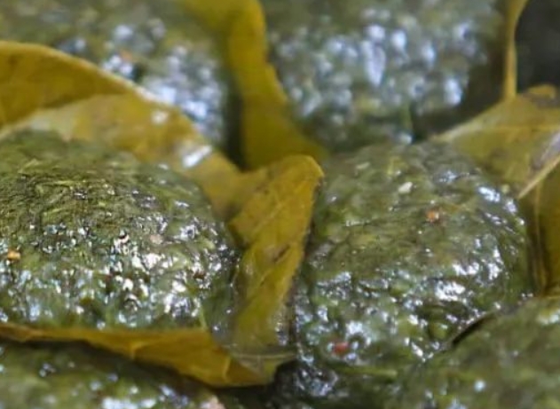 最嫩的艾叶要在每年三月份,也就是清明前几天才能采摘到。艾草采回后要洗干净煮漂两天,然后再用刀剁碎,加上糖一起放进锅里煮,再混入糯米粉和粉并揉成一个个粉团,然后包入猪肉粒,花生碎,白芝=蔴,白沙糖做的馅,制作成饼,垫上芭蕉叶上笼屉蒸40分钟,新鲜出炉的艾饼翠绿晶莹,入口软糯香滑。