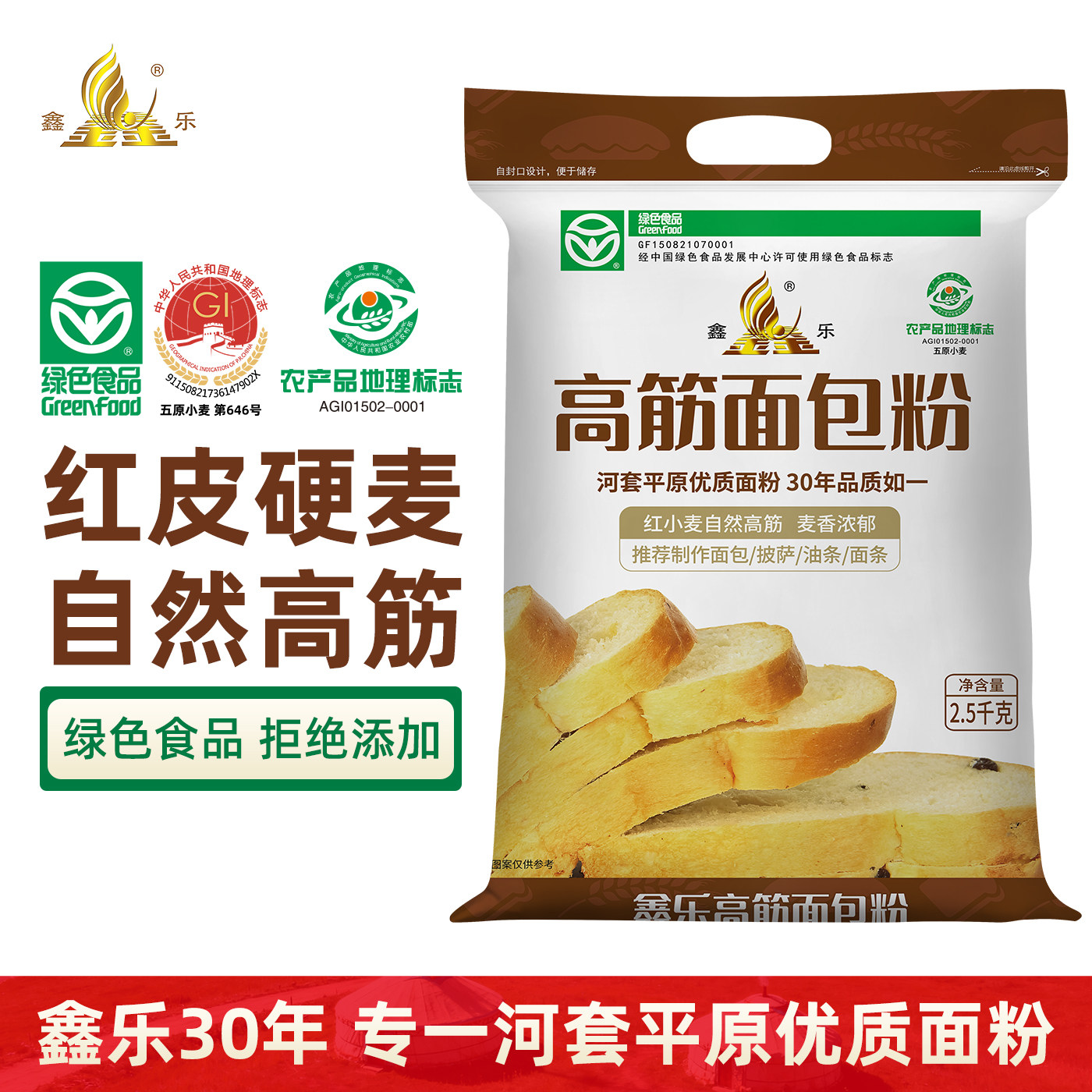 鑫乐高筋面包粉2.5kg河套红小麦自然高筋烤箱面包机烘焙绿色食品