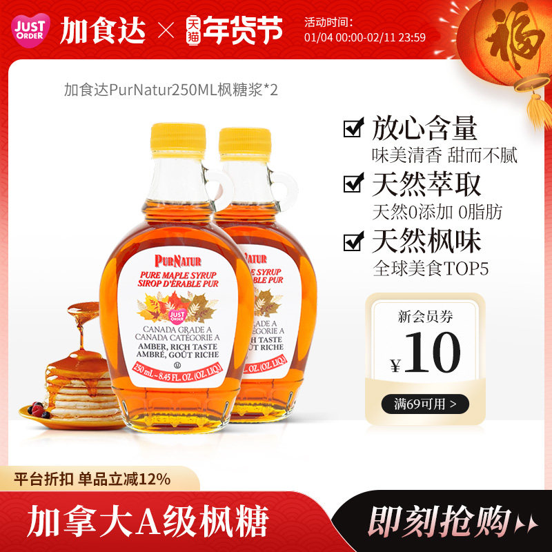 -> PURNATUR枫糖低卡低脂枫叶糖浆250ml*2 天然烘焙加拿大进口
