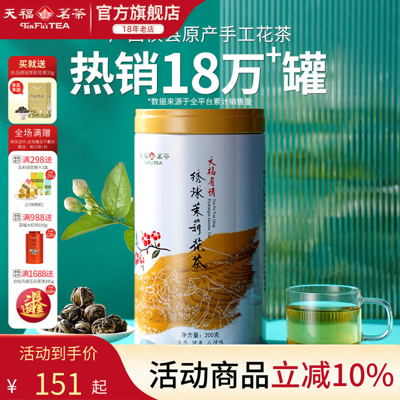-> 天福茗茶浓香型茉莉花茶罐装茶叶绣球龙珠雪环茉莉广西横县