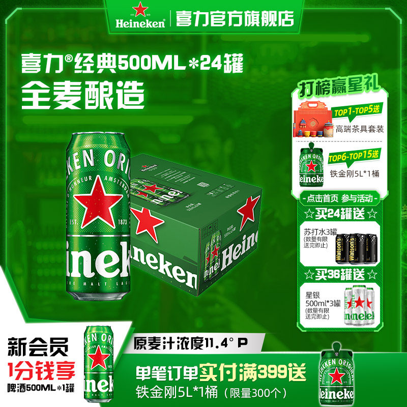 Heineken/喜力啤酒 罐装500ml*24罐整箱装 全麦酿造啤酒 官方正品