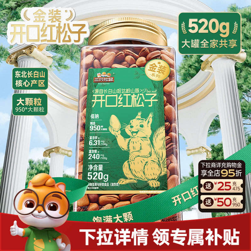 -> 三只松鼠金装长白山开口红松子520g虎皮松子罐装大颗坚果休闲零食
