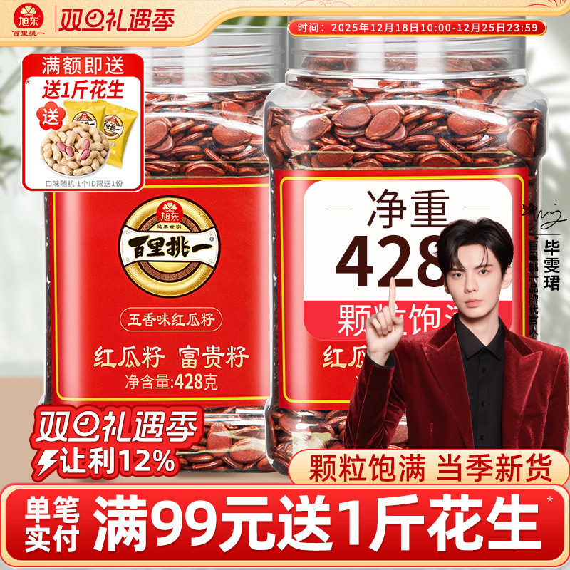 -> 旭东百里挑一红瓜子五香咸味红色皮西瓜子原味新年货零食坚果礼盒