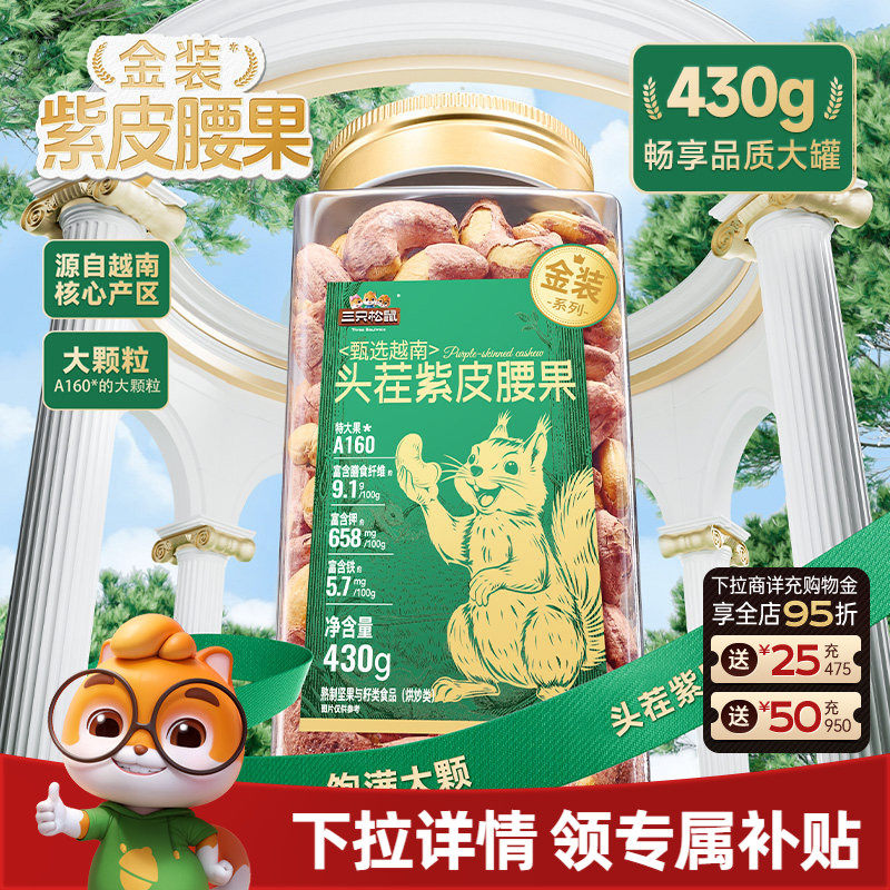 -> 三只松鼠金装越南紫皮腰果430g罐装坚果腰果仁大颗粒休闲健康零食