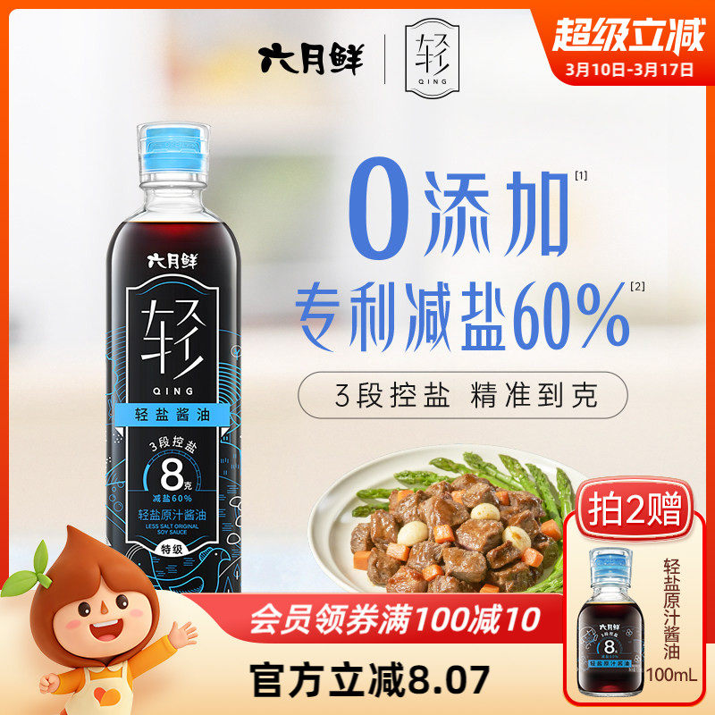 -> 六月鲜轻8克轻盐原汁酱油500ML0%添加防腐剂欣和酿造特级减盐生抽