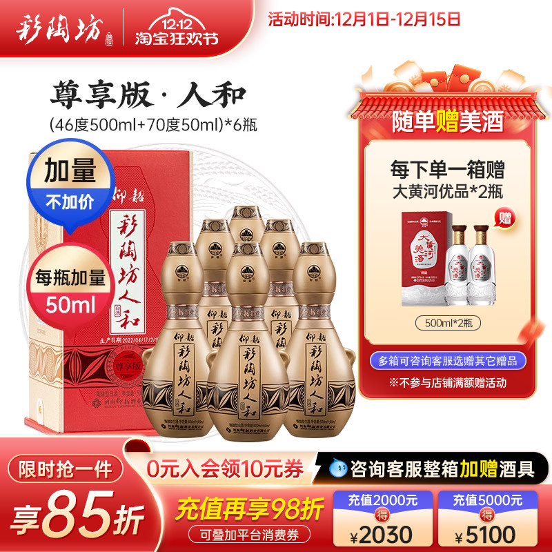 仰韶彩陶坊人和 尊享加量版白酒整箱6瓶单瓶550ml礼盒装纯粮食酒