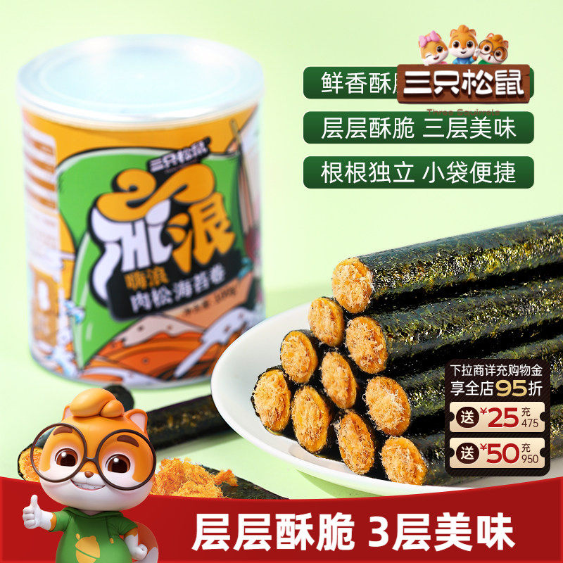 -> 【三只松鼠_肉松海苔卷100g】罐装夹心海苔海味蛋卷休闲健康零食