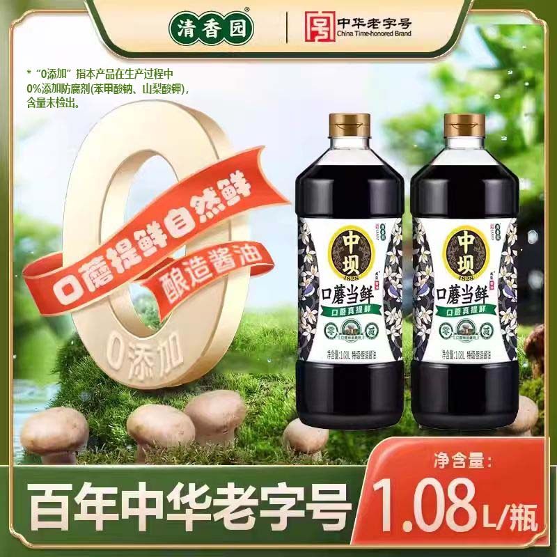 中坝酱油零添加酱油口蘑当鲜生抽1.08L*2瓶 传统工艺酿造口蘑当鲜