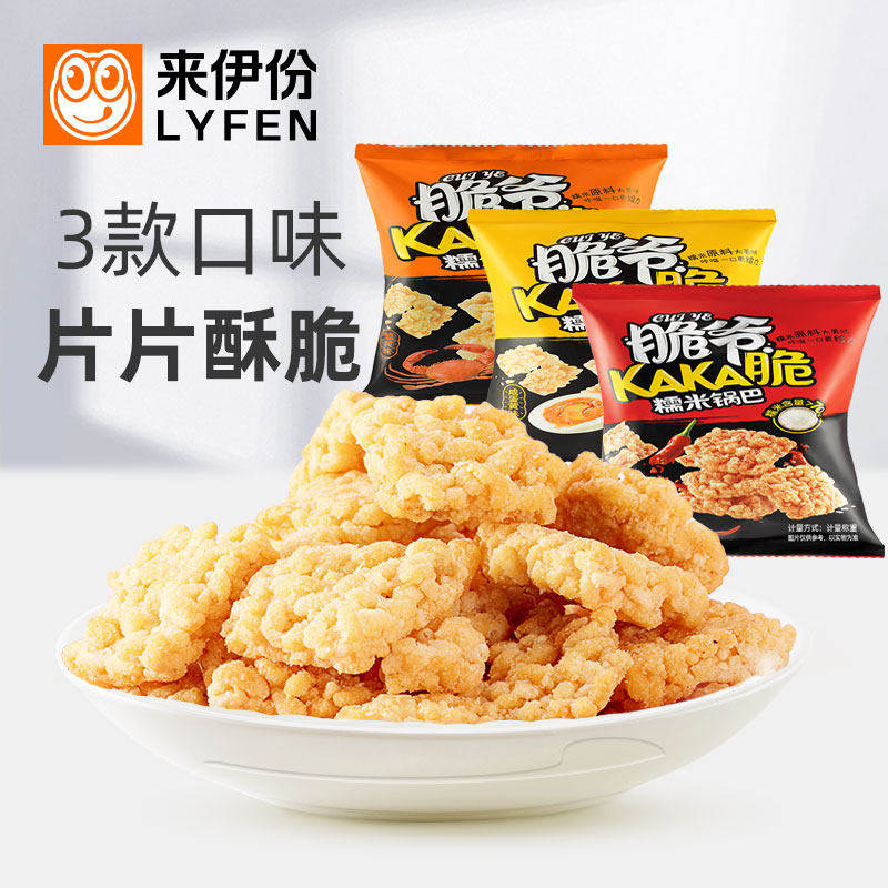 -> 来伊份KAKA脆糯米锅巴500g蟹黄味麻辣味办公室零食膨化散装来一份