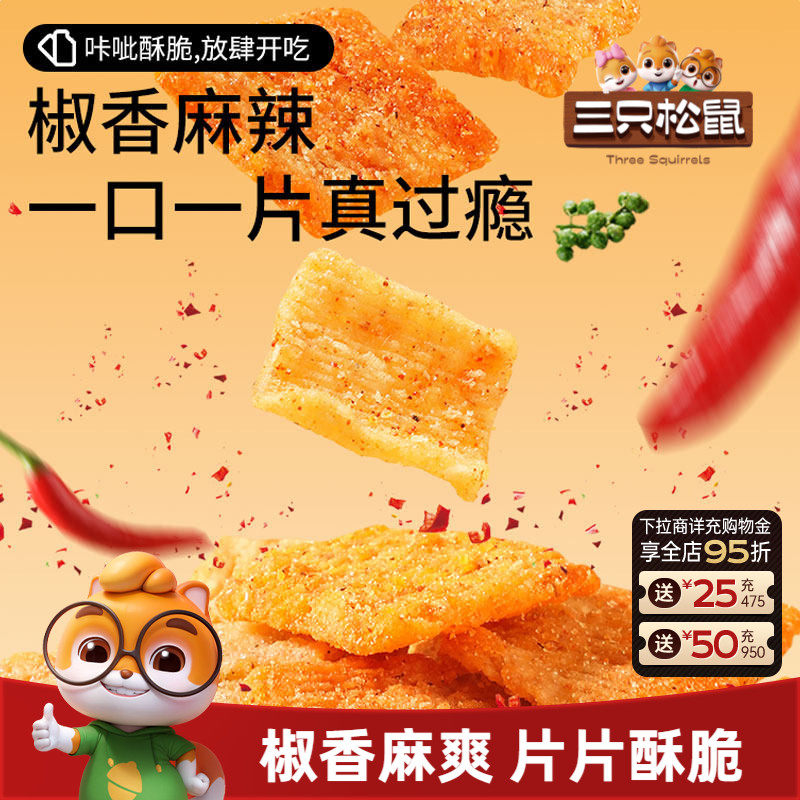 -> 三只松鼠花椒锅巴108g麻辣解馋休闲食品好吃辣味办公室网红零食