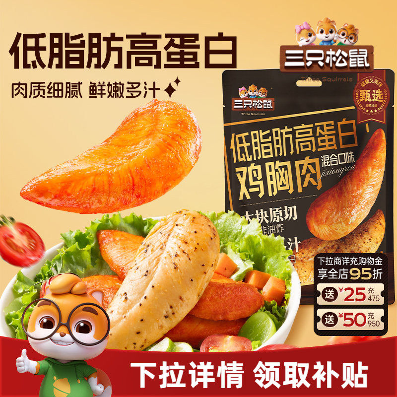 -> 三只松鼠低脂高蛋白鸡胸肉奥尔良味黑椒解馋即食代餐轻食零食小吃