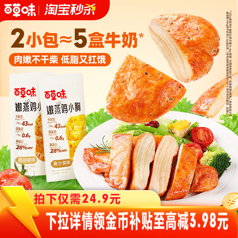 -> 百草味高蛋白鸡胸肉100g奥尔良黑胡椒味速食健身代餐即食嫩香零食