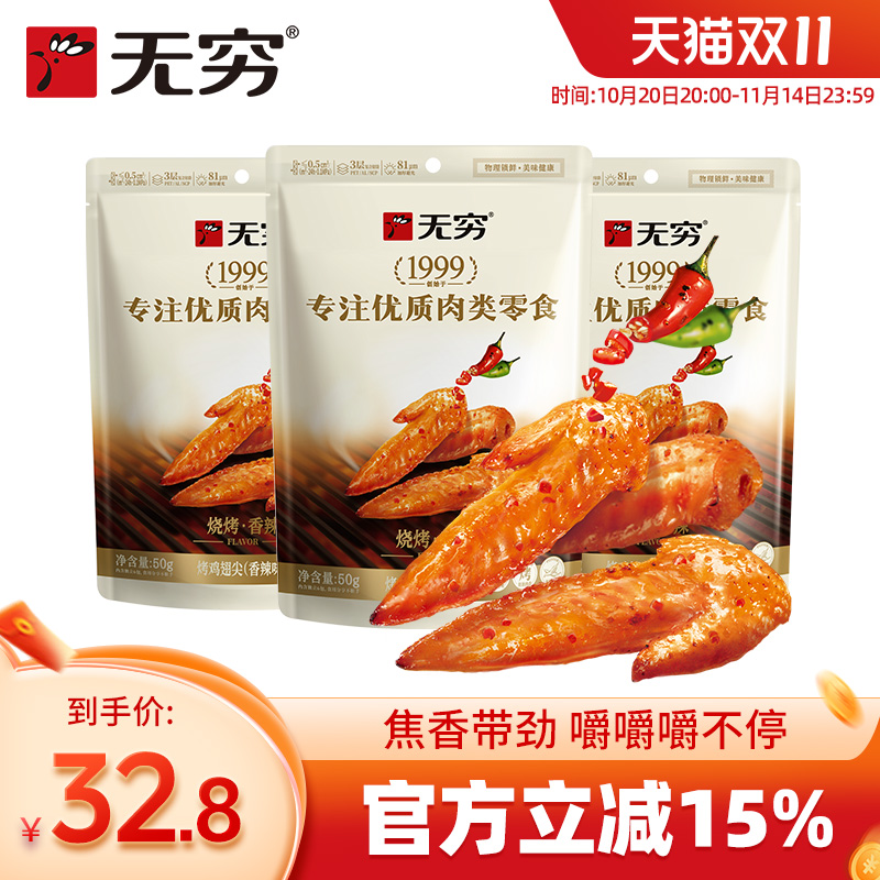 -> 无穷香辣味烤鸡小翅50g*3袋/36只鸡翅尖辣味零食小吃特产肉食熟食