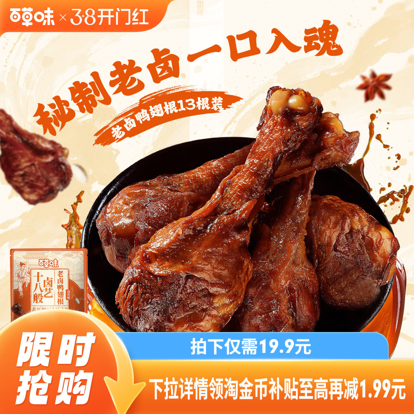 下市品百草味吮指鸭翅根428g馋肉食即食熟食鸭肉零食卤味小鸡腿夜