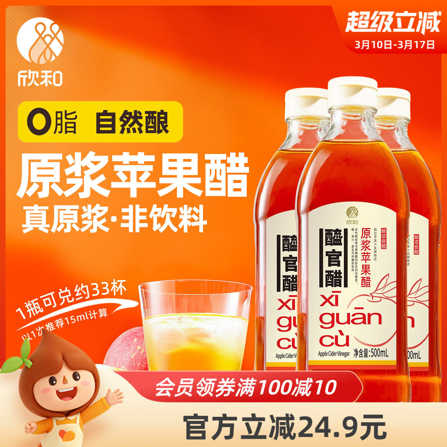 -> 欣和醯官醋原浆苹果醋500ml*3瓶 纯苹果汁发酵 0脂肪0添加防腐剂