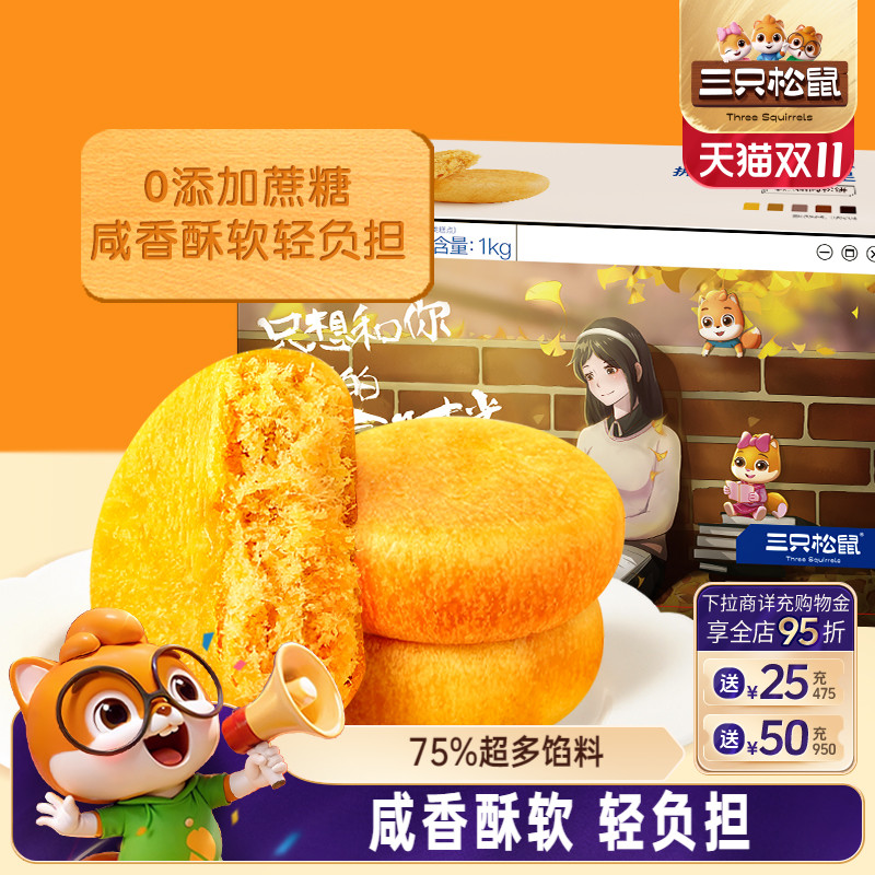 -> 三只松鼠_0蔗糖黄金肉松饼整箱营养早餐面包传统手工中式糕点零食