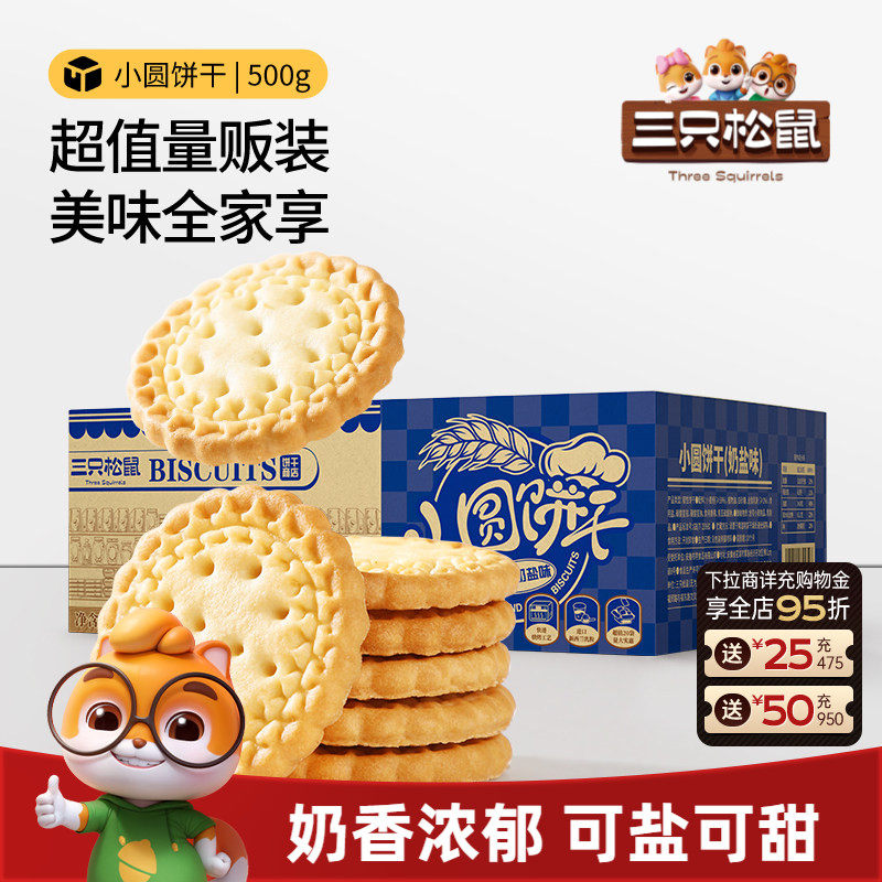 -> 三只松鼠_小圆饼奶盐味500g办公室食品充饥饼干膨化馋嘴零食小吃