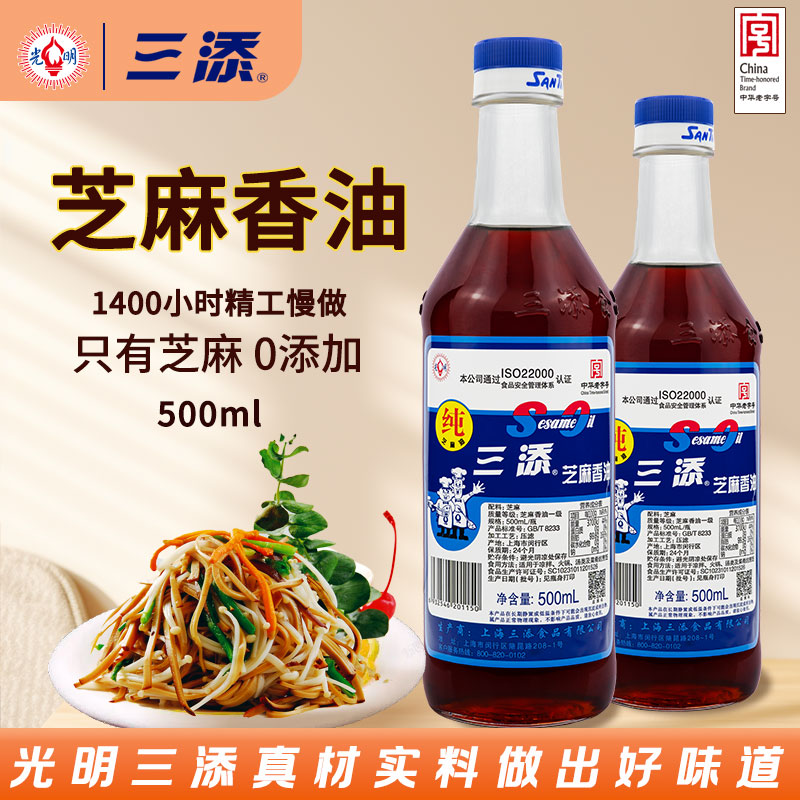 -> 三添芝麻油正宗麻油家用凉拌香油纯正一级0添加火锅油碟蘸料500ml