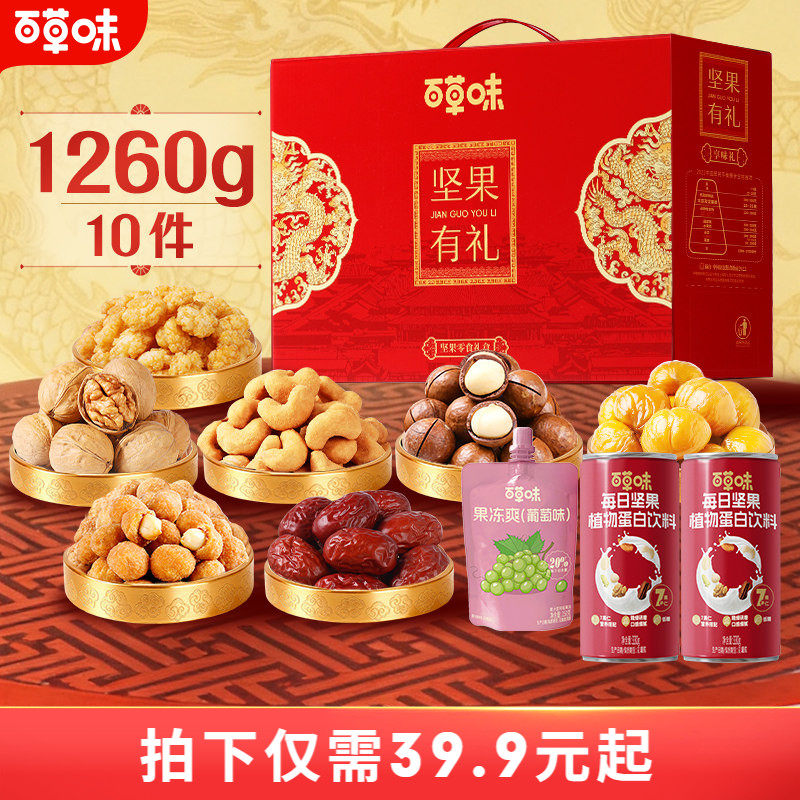 -> 百草味坚果+零食礼盒1260g混合干果零食大礼包整箱健康送礼送长辈