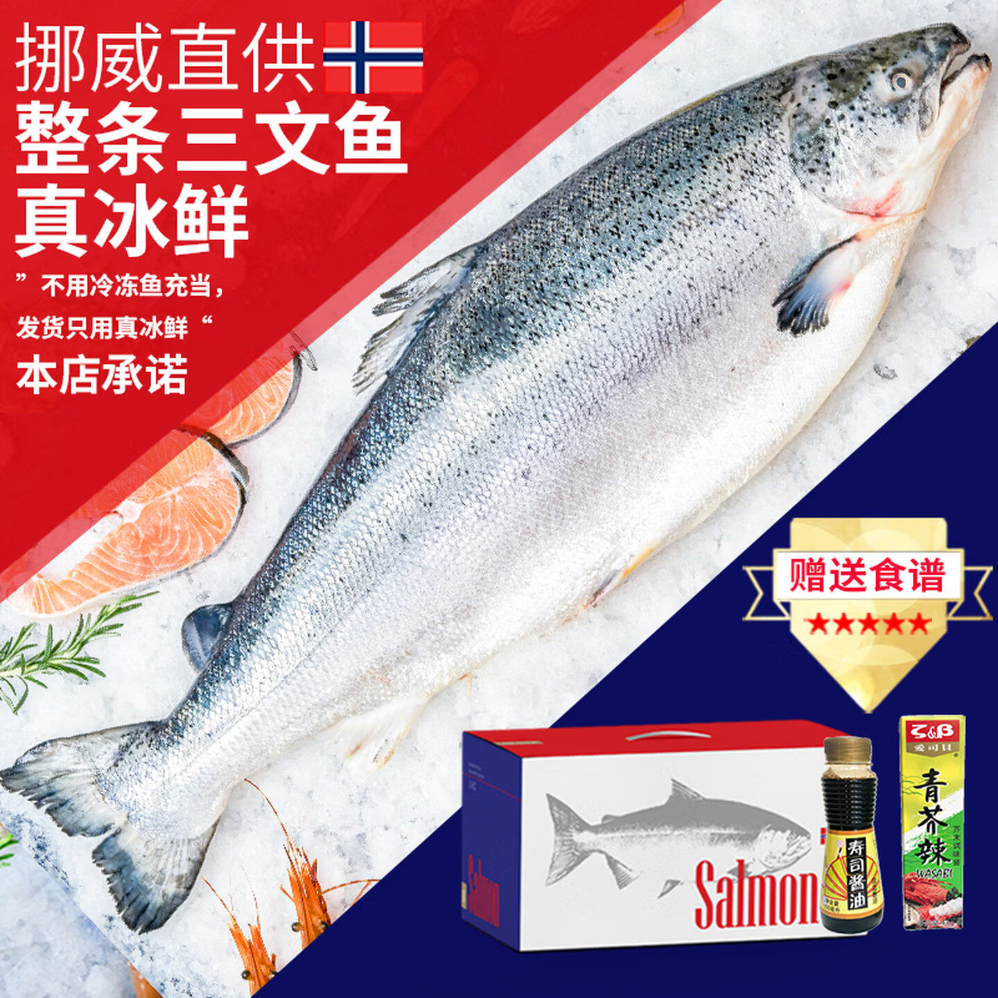 -> 挪威三文鱼整条10-12斤 冰鲜进口一整条三文鱼中段鲑鱼海鲜礼盒装