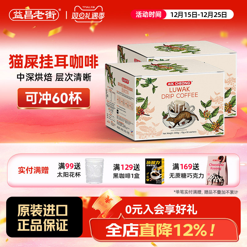 -> 马来西亚益昌老街猫屎挂耳咖啡0蔗糖手冲现磨滤袋咖啡美式60杯