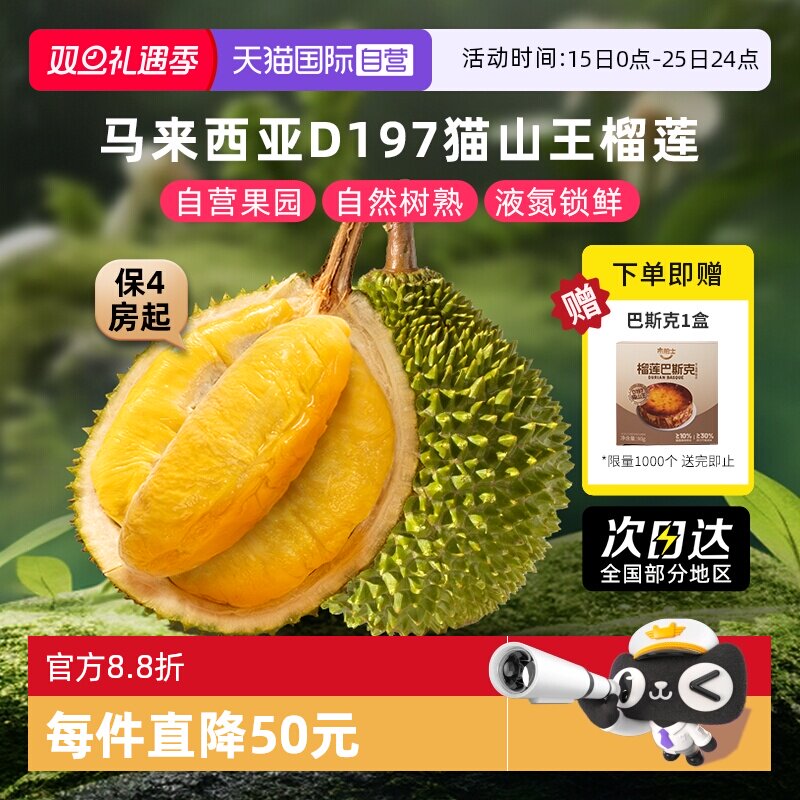 【自营】市舶士马来西亚进口D197猫山王榴莲液氮整果新鲜水果顺丰