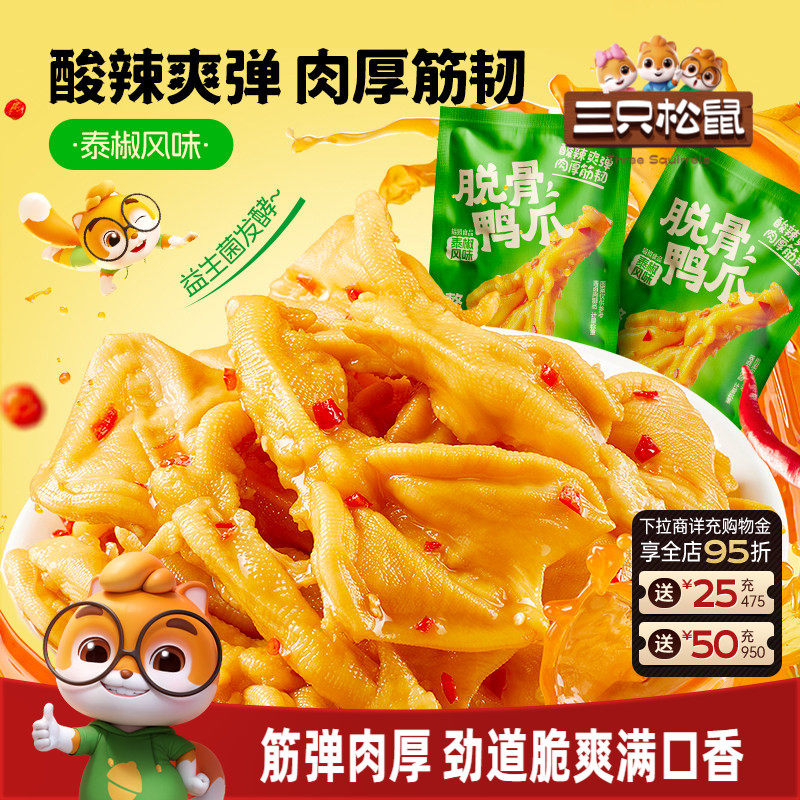 -> 三只松鼠_脱骨鸭掌泰椒风味卤味鸭爪去骨鸭掌休闲零食解馋小吃