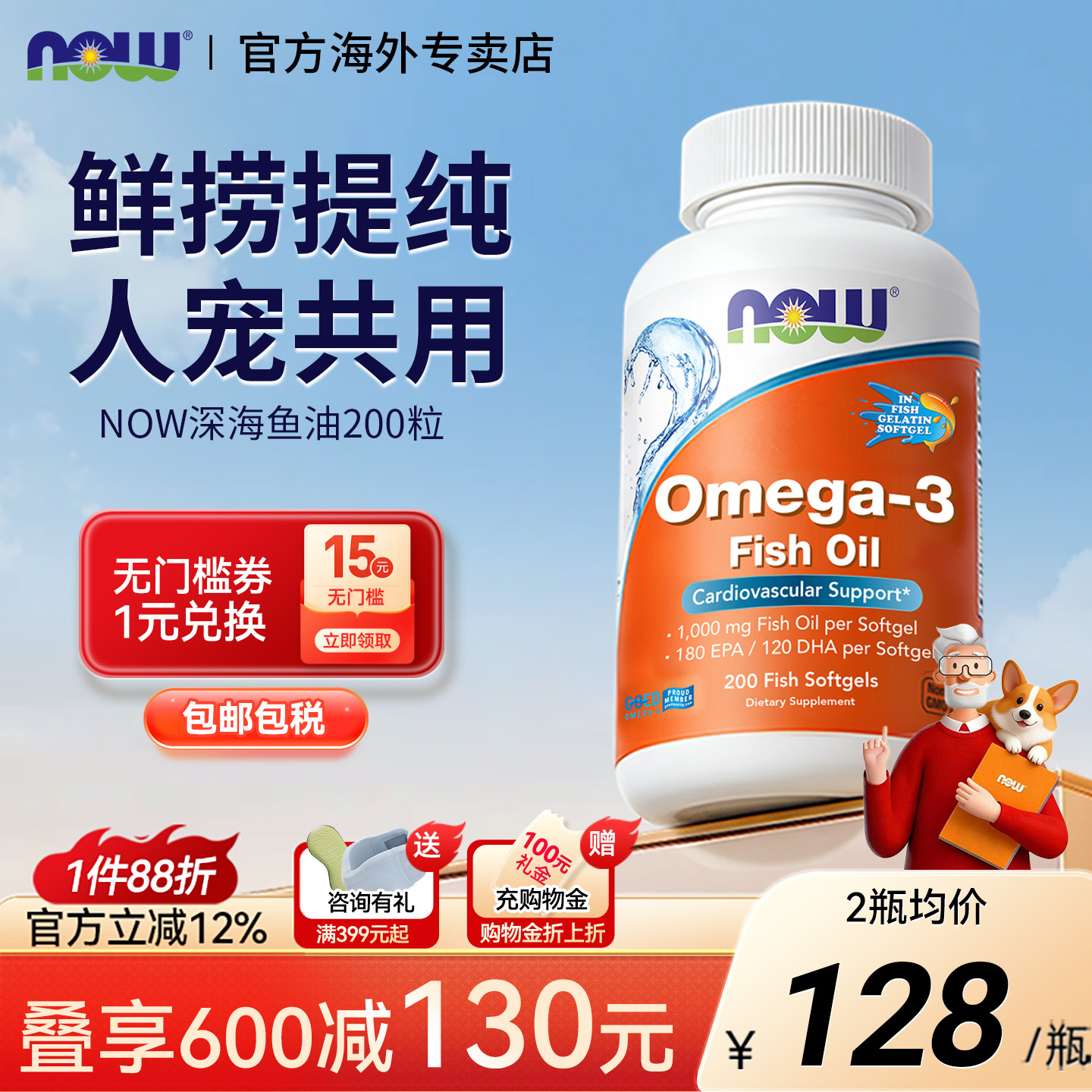 -> nowfoods诺奥深海鱼油软胶囊人宠共用鱼油猫咪狗狗专用美毛亮毛