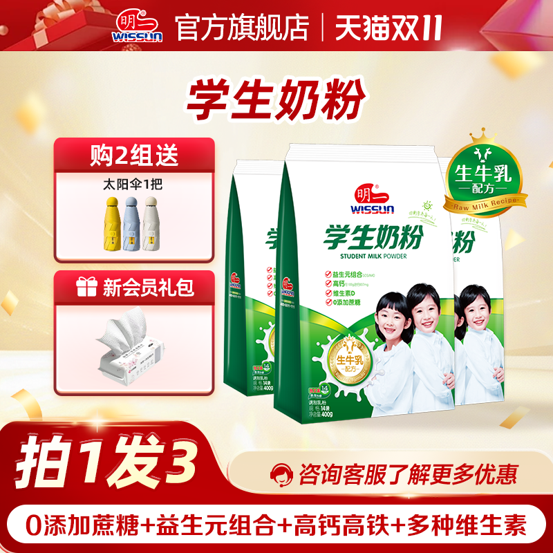 明一学生青少年高钙营养牛奶粉含多维400g*3袋装内含独立小袋