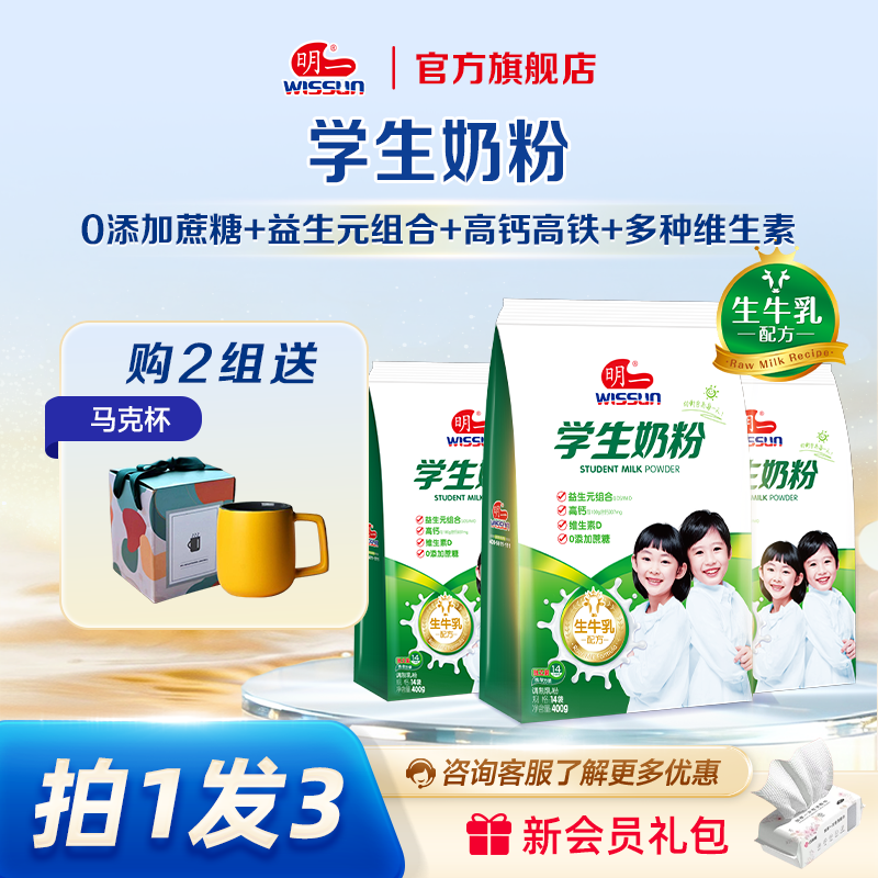 -> 明一学生青少年高钙营养牛奶粉含多维400g*3袋装内含独立小袋