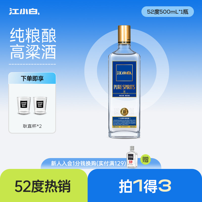 -> 江小白金盖52度500ml单瓶口粮酒高度白酒高粱酒纯粮食酒清香酒
