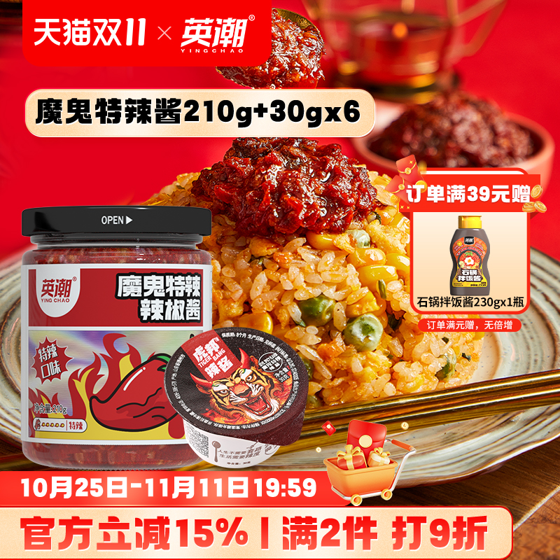 -> 英潮魔鬼特辣酱虎邦牛肉辣酱下饭菜香菇蒜蓉拌饭面辣椒酱料2瓶装