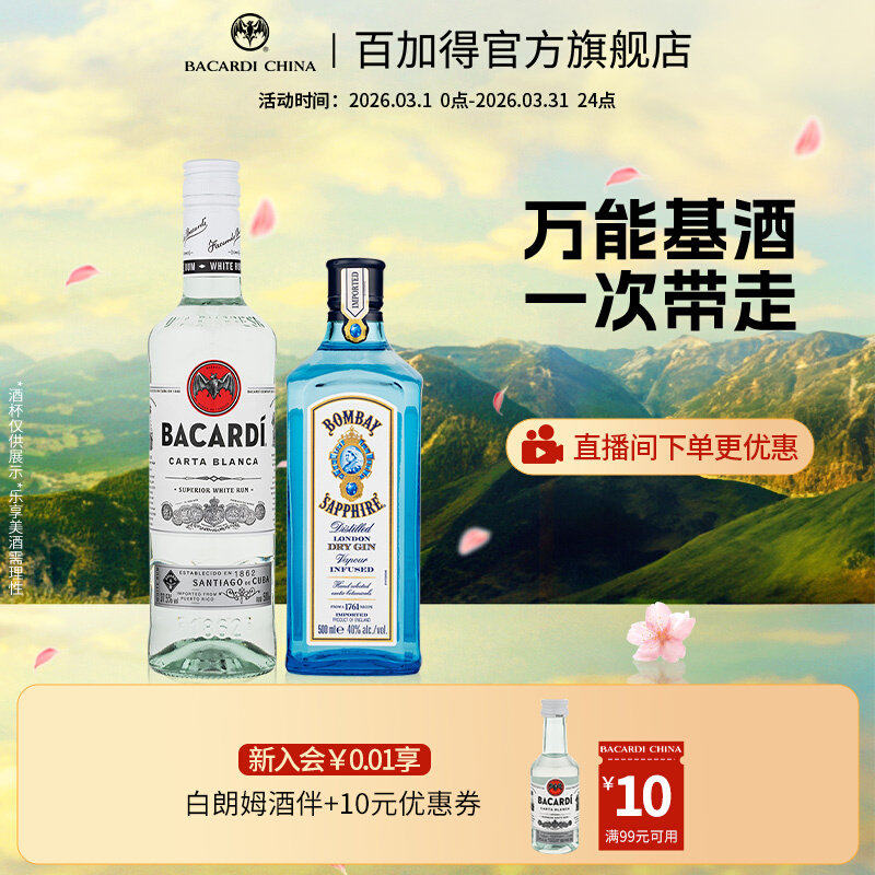 -> 【万能基酒套组】孟买蓝宝石金酒+百加得白朗姆酒500ml*2洋酒调酒