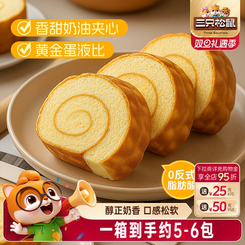 -> 【三只松鼠_虎皮蛋糕牛奶味400g】瑞士卷整箱蛋糕休闲点心零食