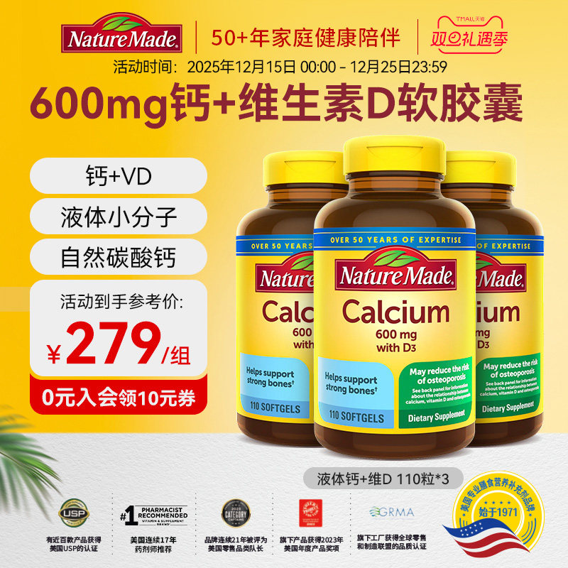 NatureMade天维美美国原装进口液体钙维生素D3中老年补钙110粒*3