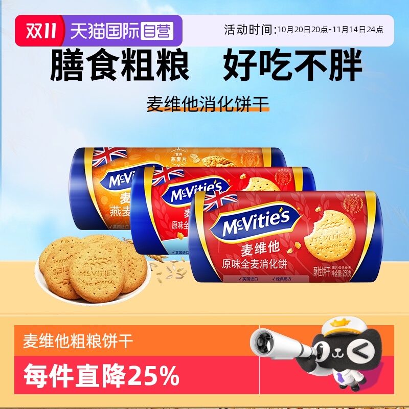 【自营】麦维他英国全麦消化饼干250g燕麦杂粮早餐代餐粗粮零食