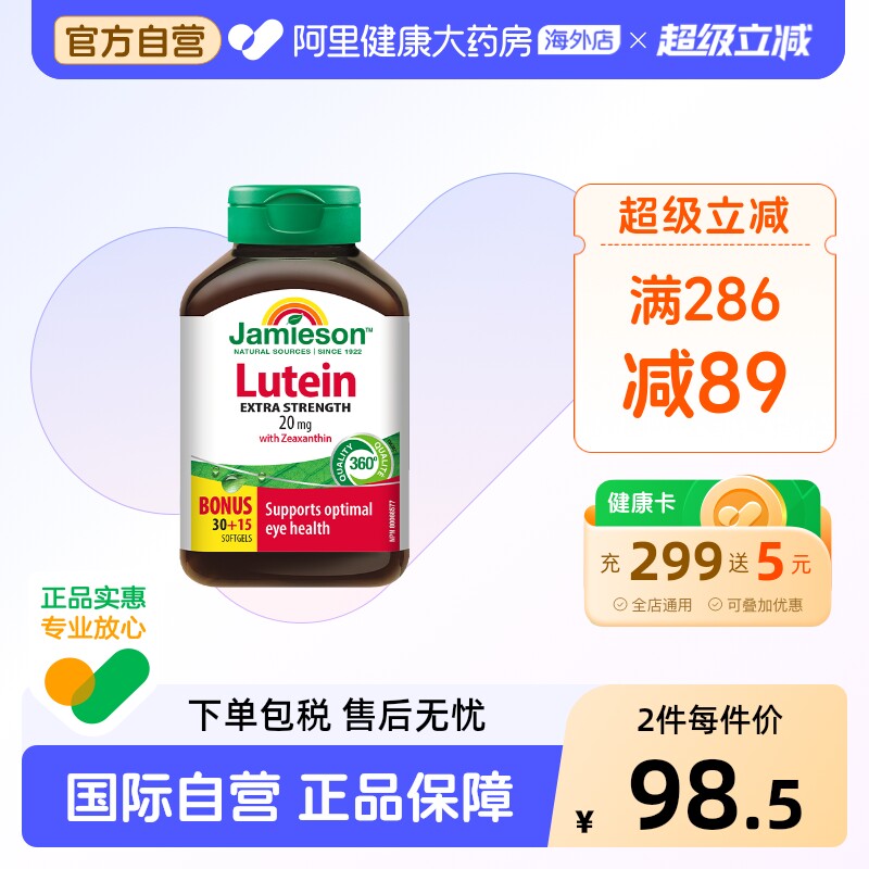 -> jamieson健美生叶黄素软胶囊20mg45粒青少年成人护眼片缓解眼干涩