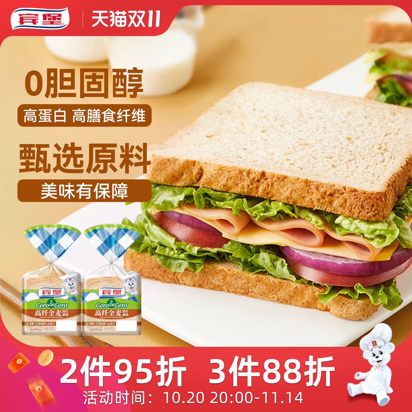 -> Bimbo宾堡高纤维全麦切片面包400g/包早餐零食粗粮吐司片