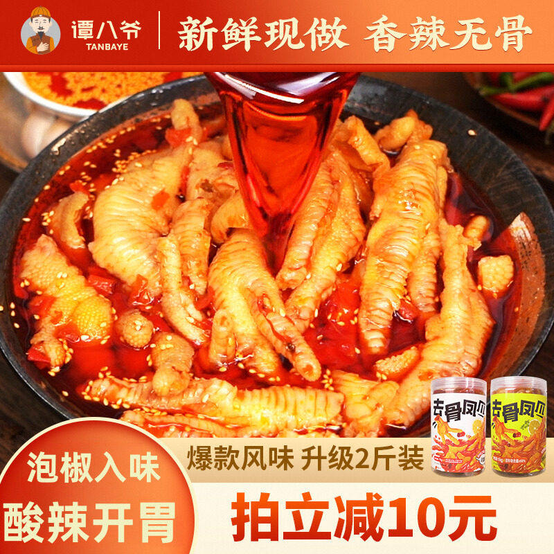 -> 谭八爷无骨鸡爪2斤柠檬酸辣脱骨去骨凤爪红油泡椒子即食零食罐装