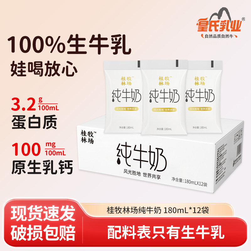 -> 皇氏乳业桂牧林场纯牛奶180ml*12袋儿童学生营养早餐牛奶纯奶整箱