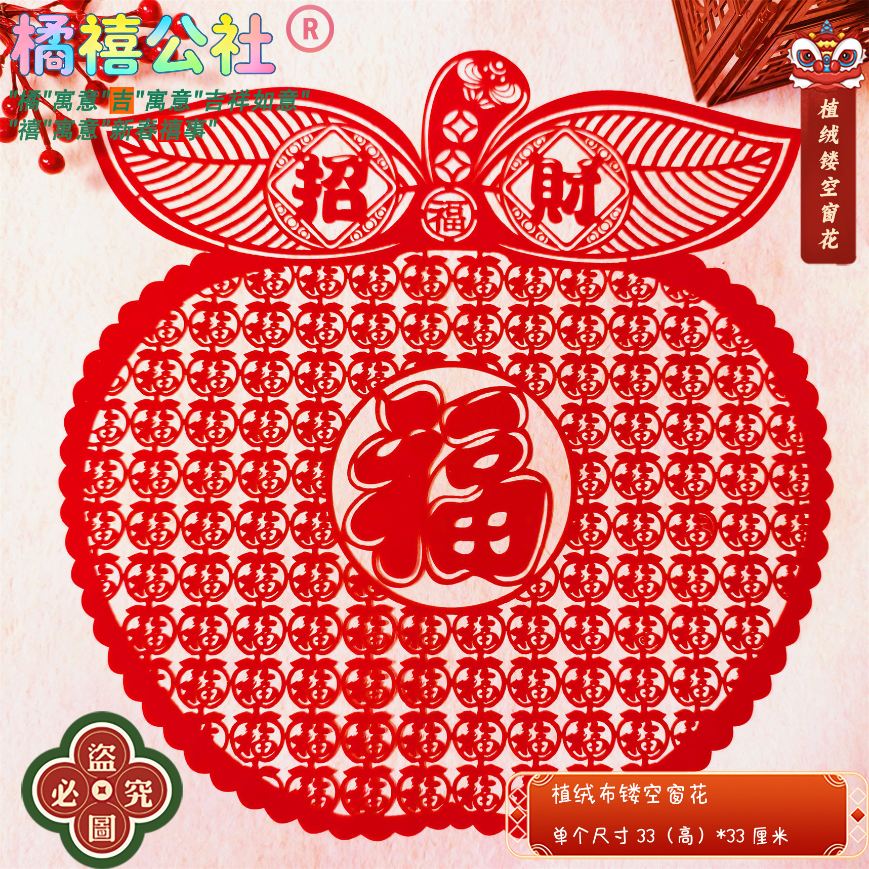 大号半开金粉植绒布吊钱新年贴大玻璃门厨窗