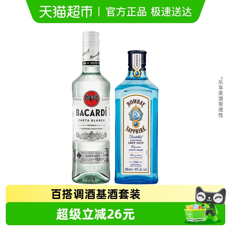 百加得白朗姆酒+孟买蓝宝石金酒调酒组合500ml*2瓶