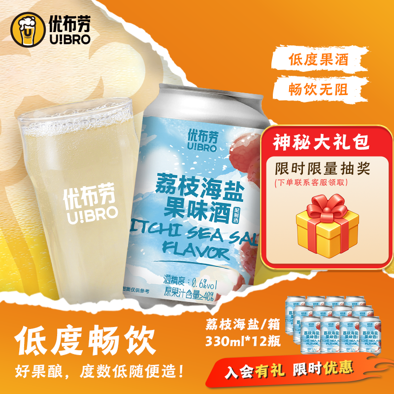 -> 优布劳精酿啤酒海盐荔枝330ml*12罐女士微醺果啤低度荔枝啤酒整箱
