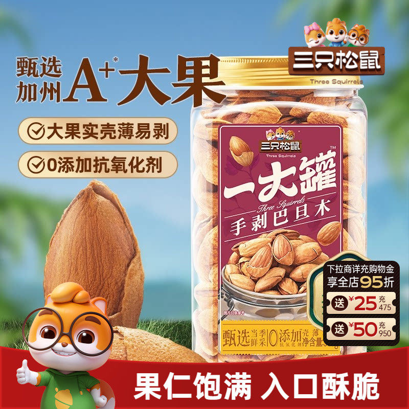 -> 三只松鼠一大罐巴旦木500g罐装大颗粒健康坚果炒货休闲零食干果