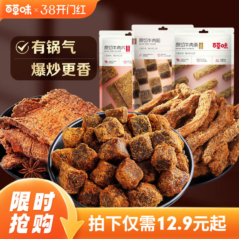 -> 百草味原切牛肉条50g五香牛肉干肉粒牛肉片休闲零解馋牛肉TG