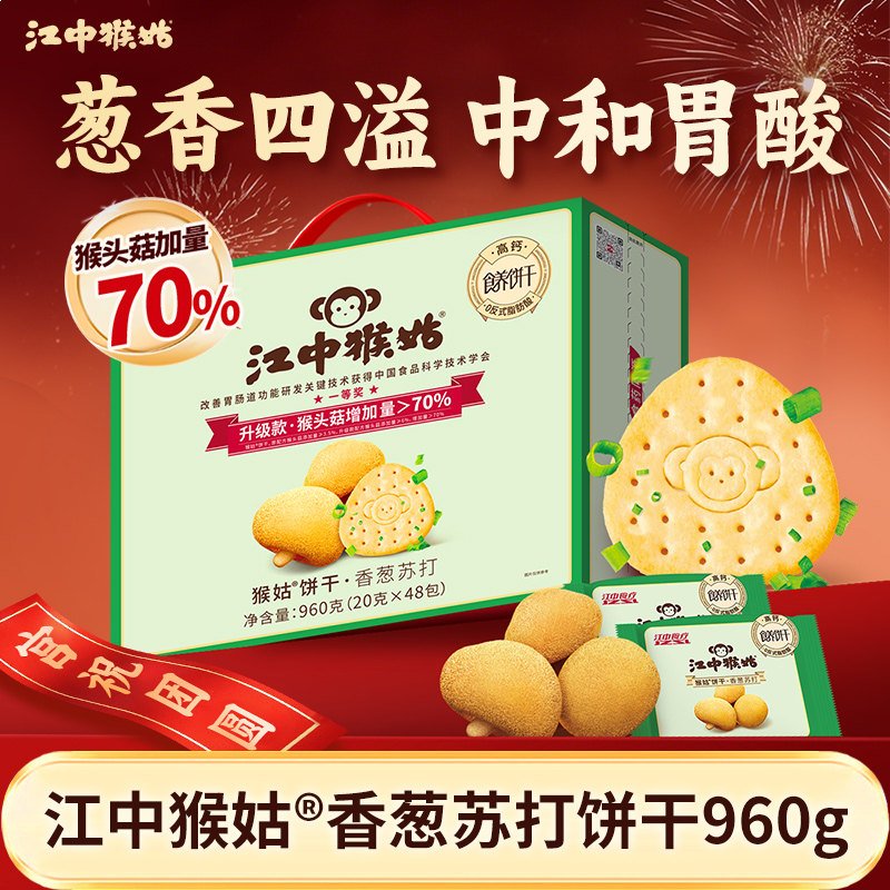 -> 江中猴姑香葱苏打饼干48包咸味养胃猴头菇碱性中和胃酸送礼盒