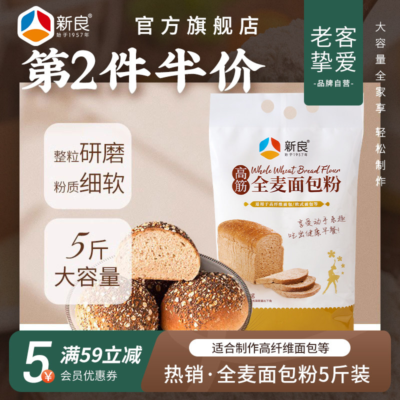 -> 新良全麦面包粉2.5kg烘焙家用高筋粉全麦面粉含麦麸粗粮面包专用
