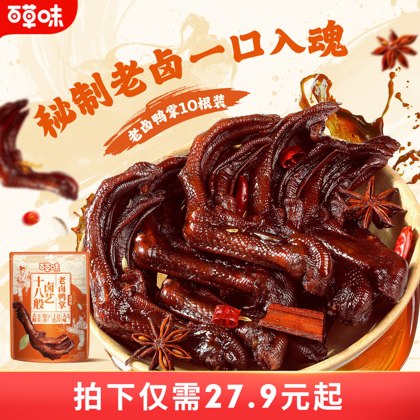 -> 百草味卤鸭掌305g10只泡椒去骨酸辣无骨鸭爪五香味休闲零食脱骨