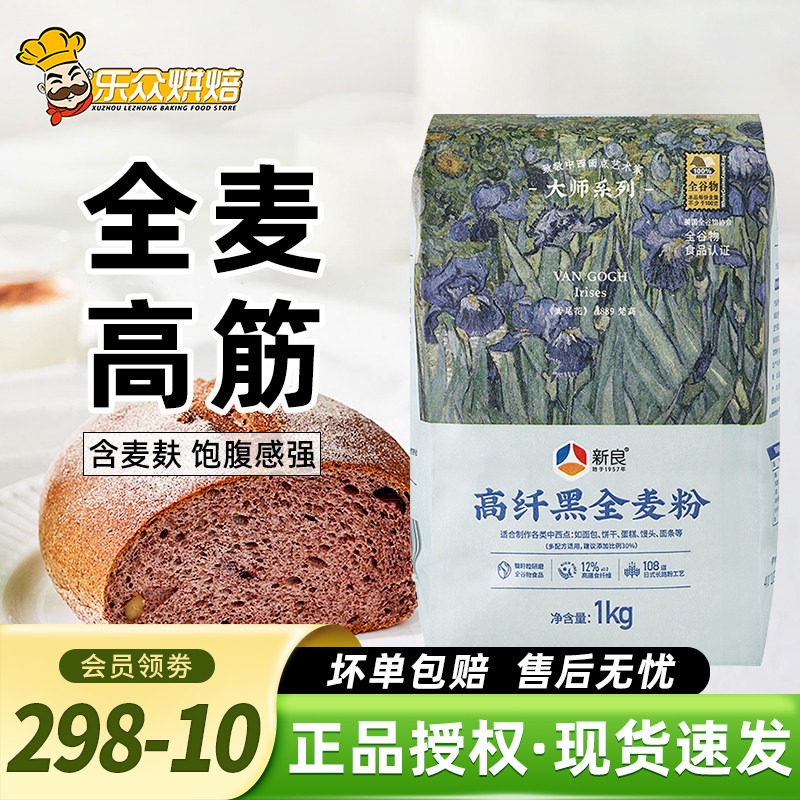 -> 新良大师系列黑全麦高筋面粉1kg含麦麸全麦面包粉家用烘焙高筋粉