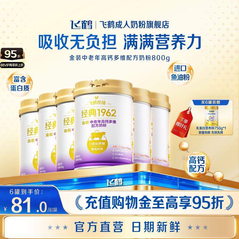 -> 飞鹤1962金装中老年高钙成人多维营养牛奶粉800g*6罐营养品正品